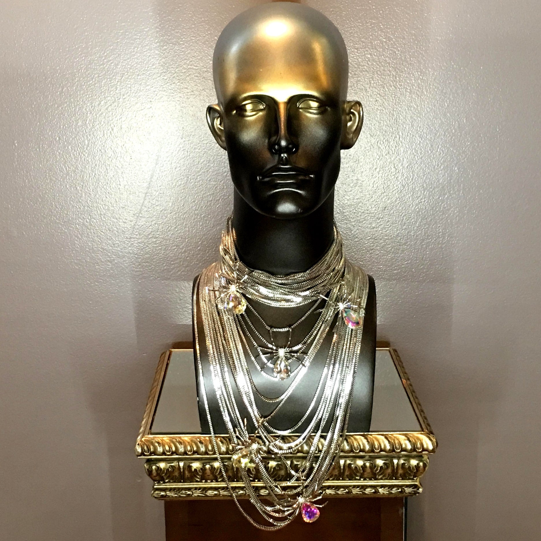 I created the "Spider & Web" necklace & necklace combo using Swarovski crystals for the body of the spiders and 19 strands of sterling silver plated box chain for the choker and 16 strands for the necklace to show you that spiders and their webs could be considered beautiful! The crystals chosen are "Crystal", "Jonquil" and "Aurora Borealis-AB".