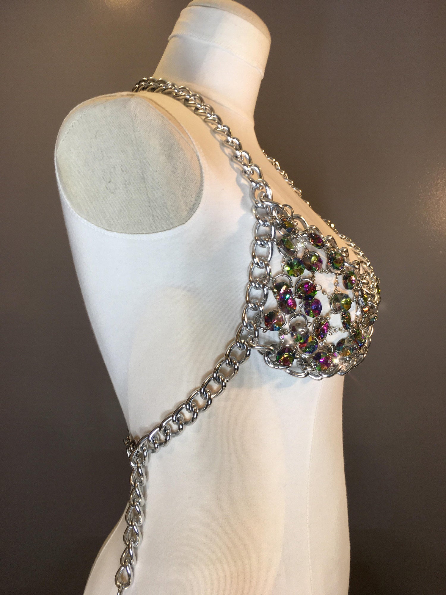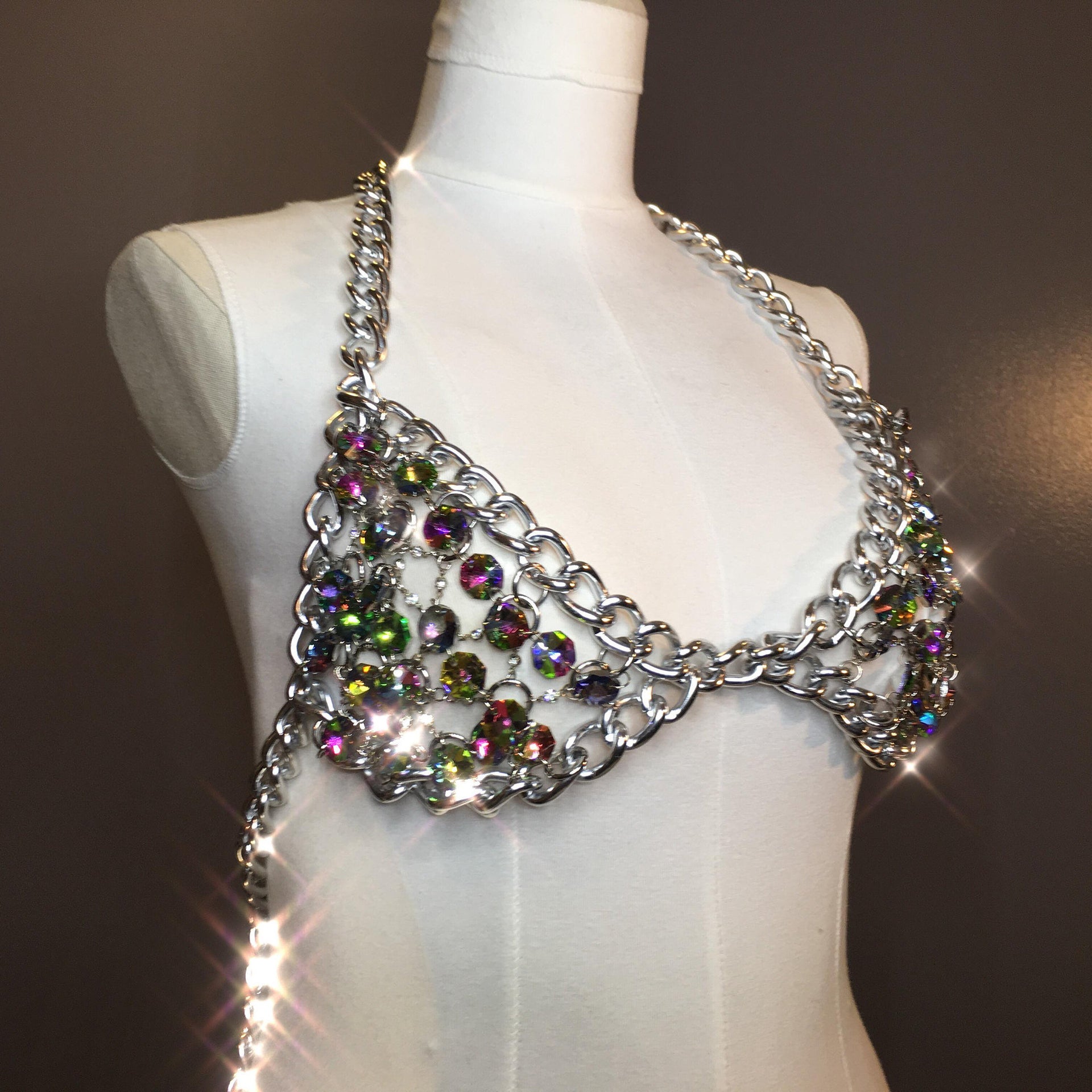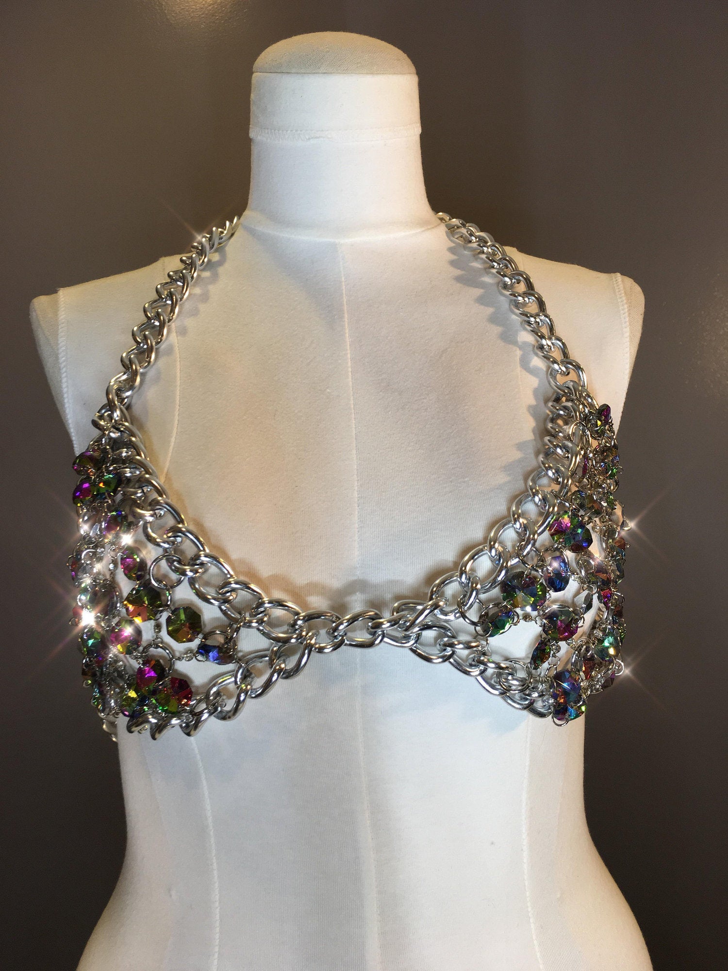 This Gorgeous top features a lattice work of multicolor crystal beads, clear crystals and chain. The top fastens in the back with adjustable chain closures and crab claw clasps. This beauty is lightweight, comfortable, completely adjustable and took approximately 1 week to create this stunning high fashion couture showpiece!