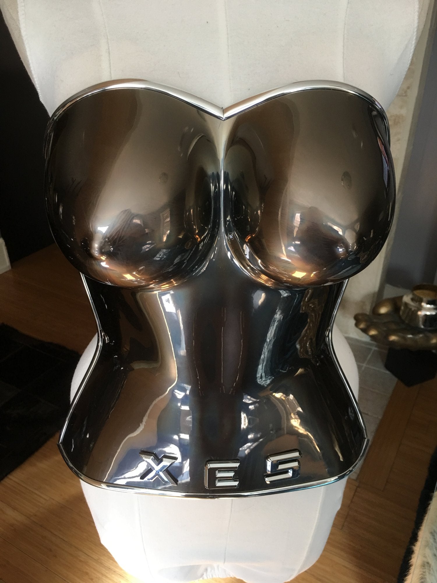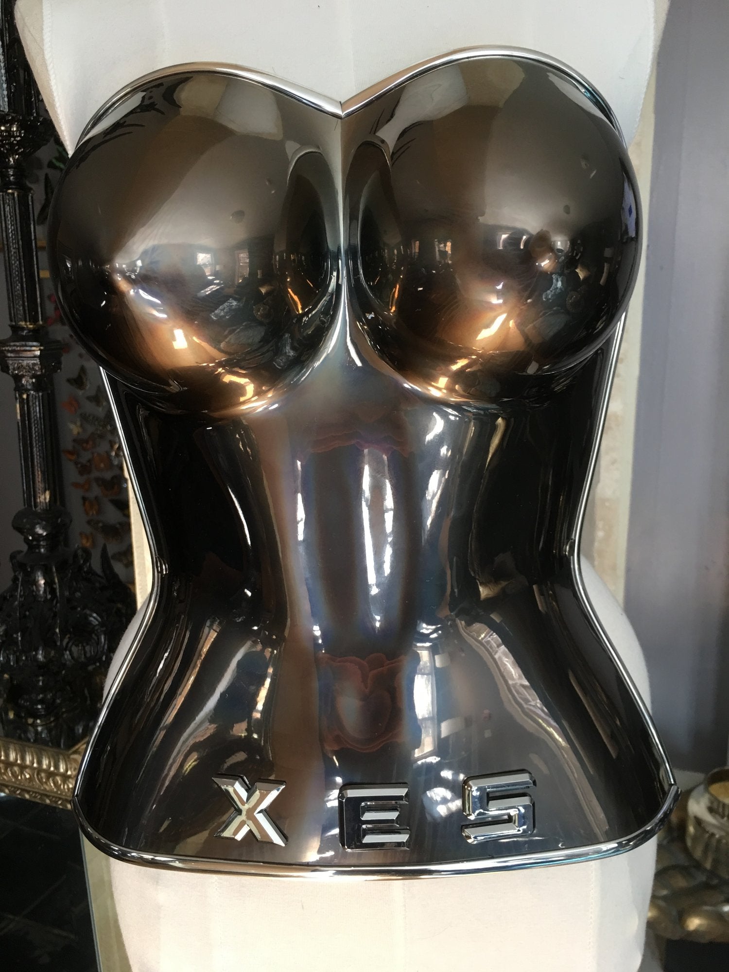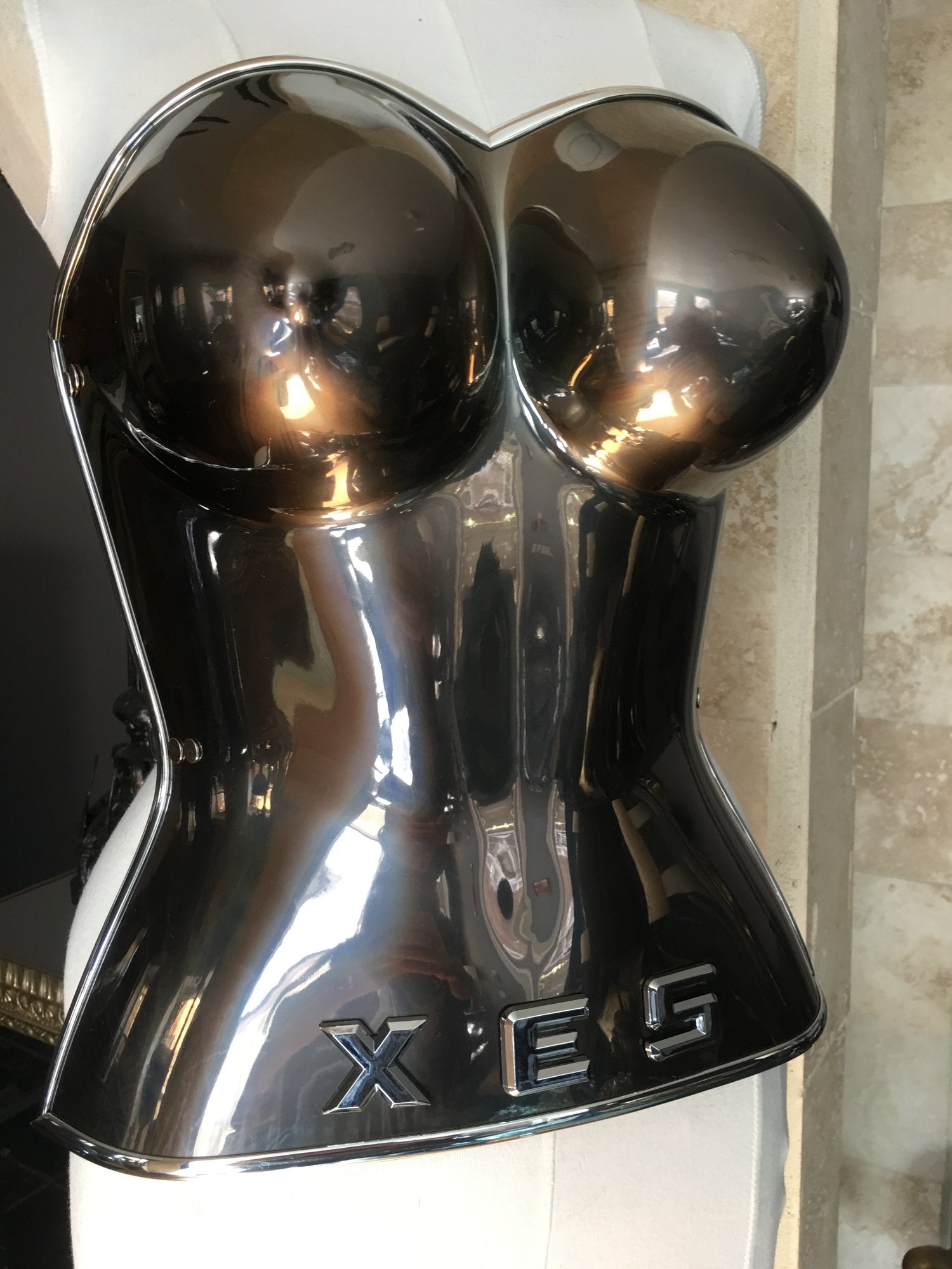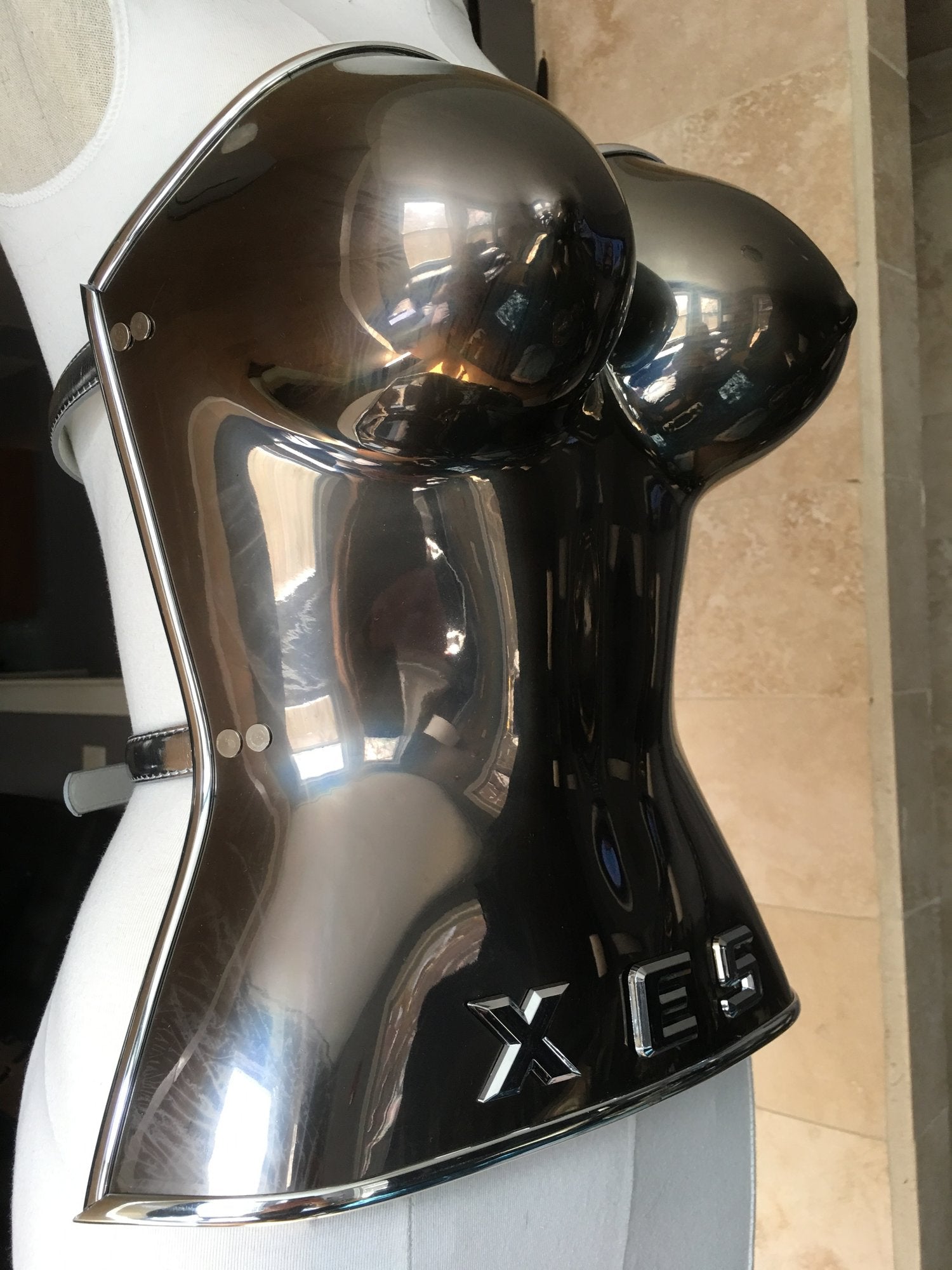 El corpiño de acrílico cromado tiene adornos plateados cromados y correas y hebillas de cuero plateadas ajustables.