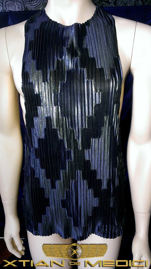 XXXextremadamente ligero y transpirable durante los veranos más calurosos. Cuenta con cortes laterales profundos para un movimiento sin restricciones, corte en la parte posterior, acabado plegado de origami de alto metal en un patrón de diamante en "X" y negro metálico en el reverso. ¡Diseñé esta camisa sin dobladillos para que fluya y se ajuste a la forma de tu cuerpo!
