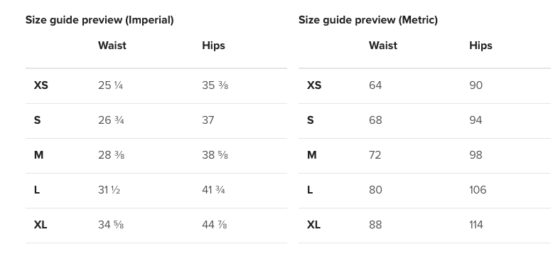 XS | 25 ¼ | 35 ⅜ |