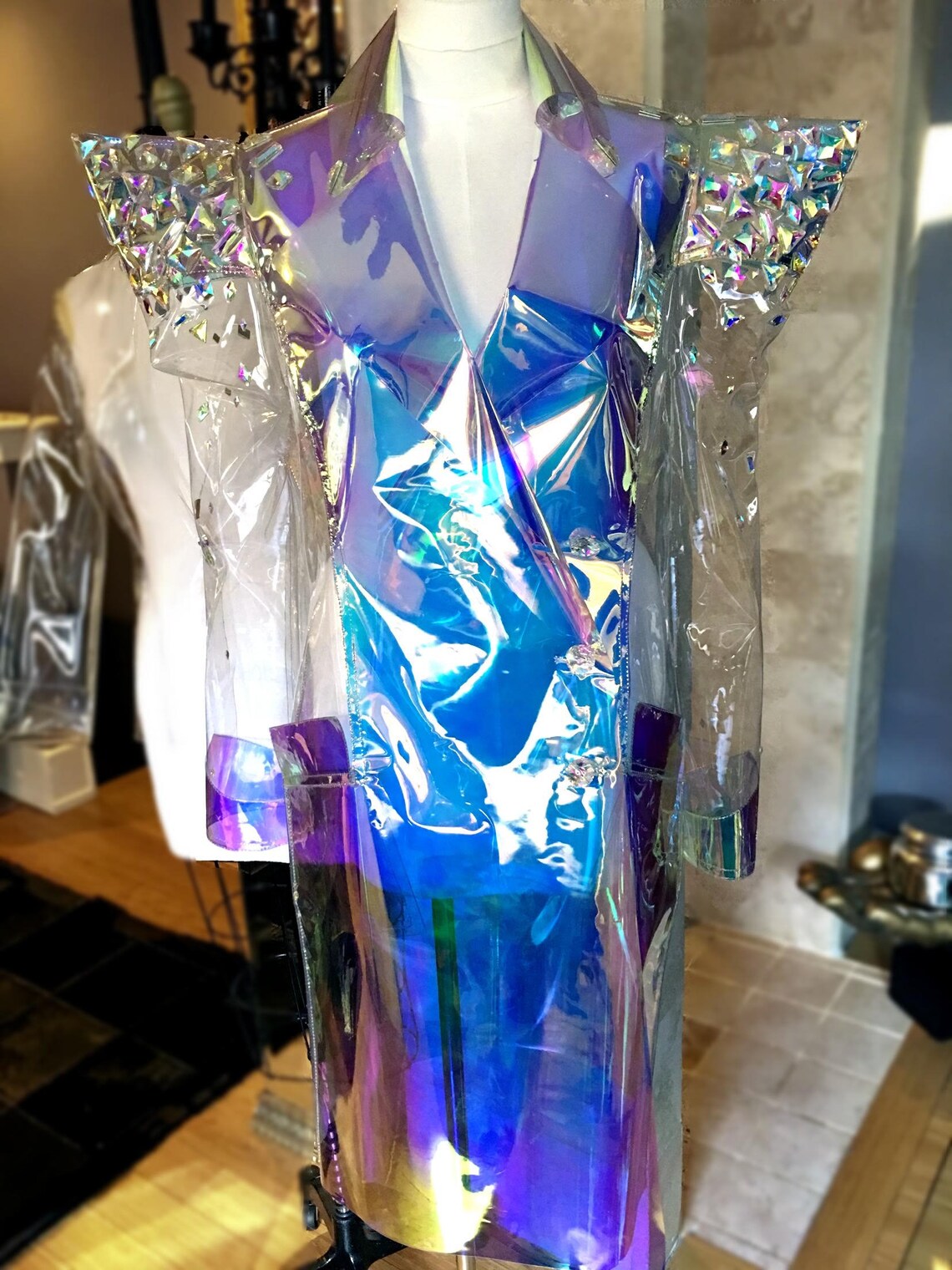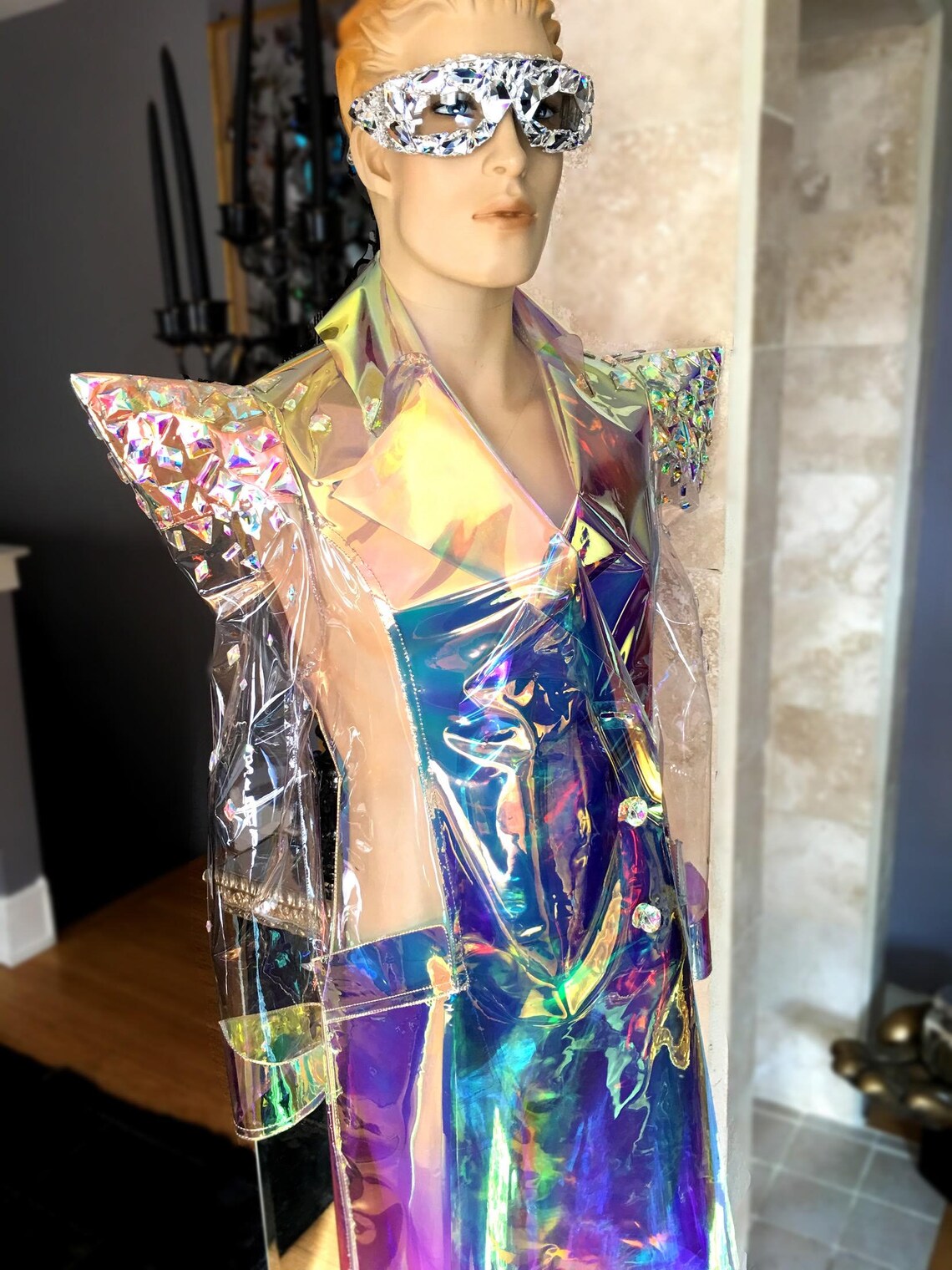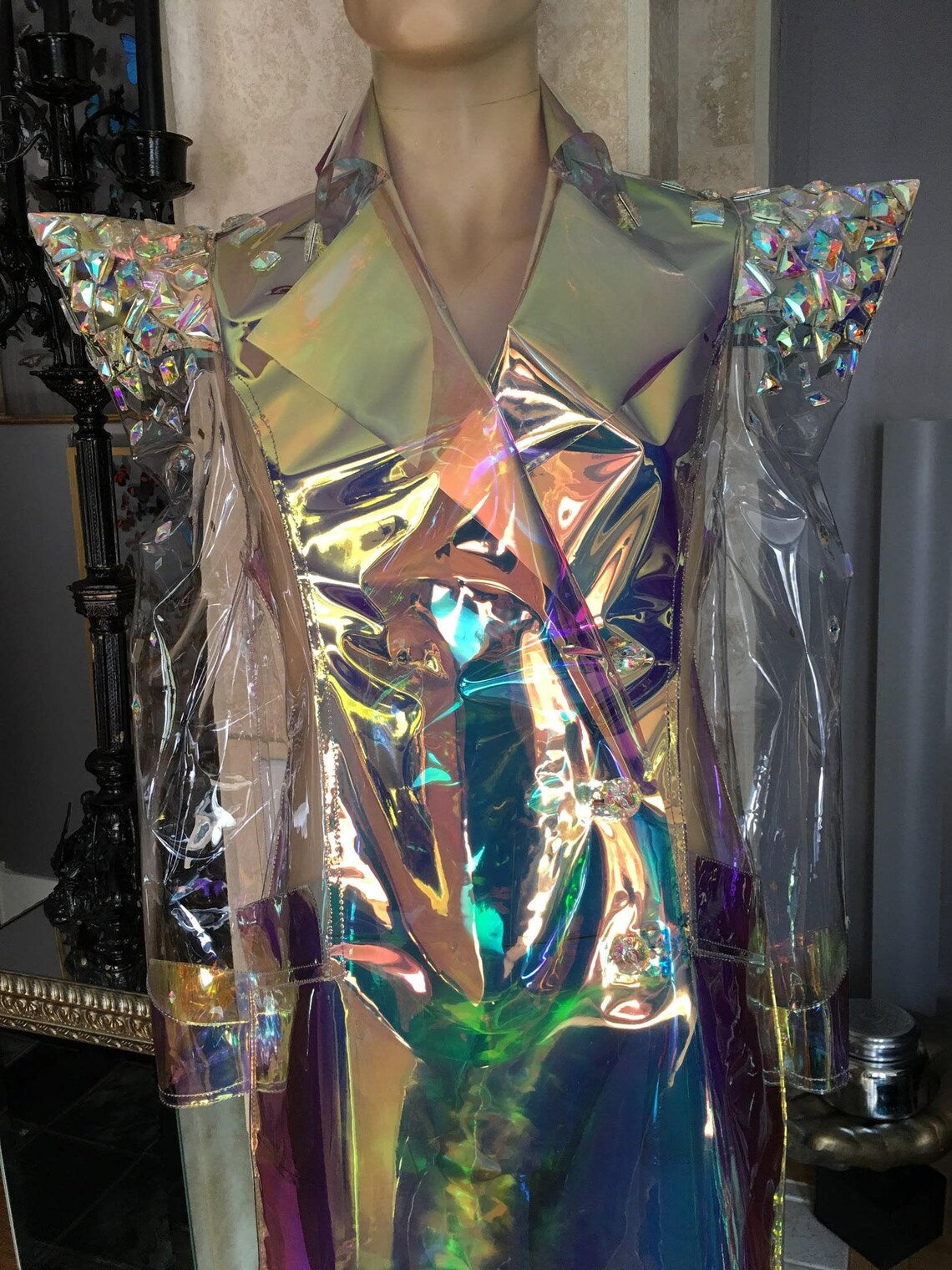 Originally designed for Lady Gaga , this tailored trench coat is out of this world. This jacket is a one-of-a-kind and is detailed in antique Swarovski crystal buttons and Swarovski crystal element details on the shoulders and sleeves. This jacket features clear vinyl side panels and pockets. Can be worn alone or over top your choice of clothing style. This is a jacket no one will forget! Don't get caught out in the rain unless you're wearing this beauty!