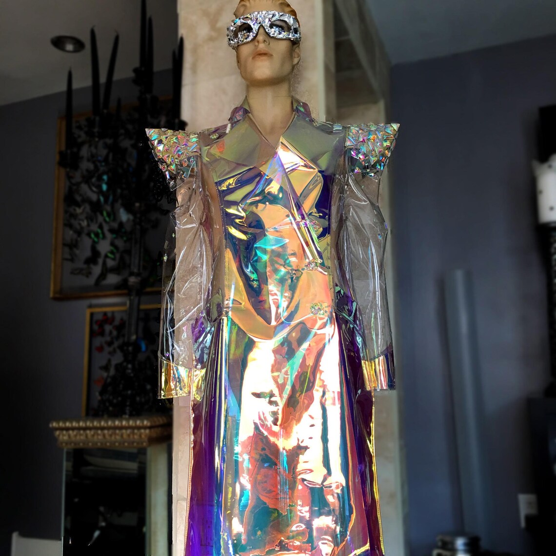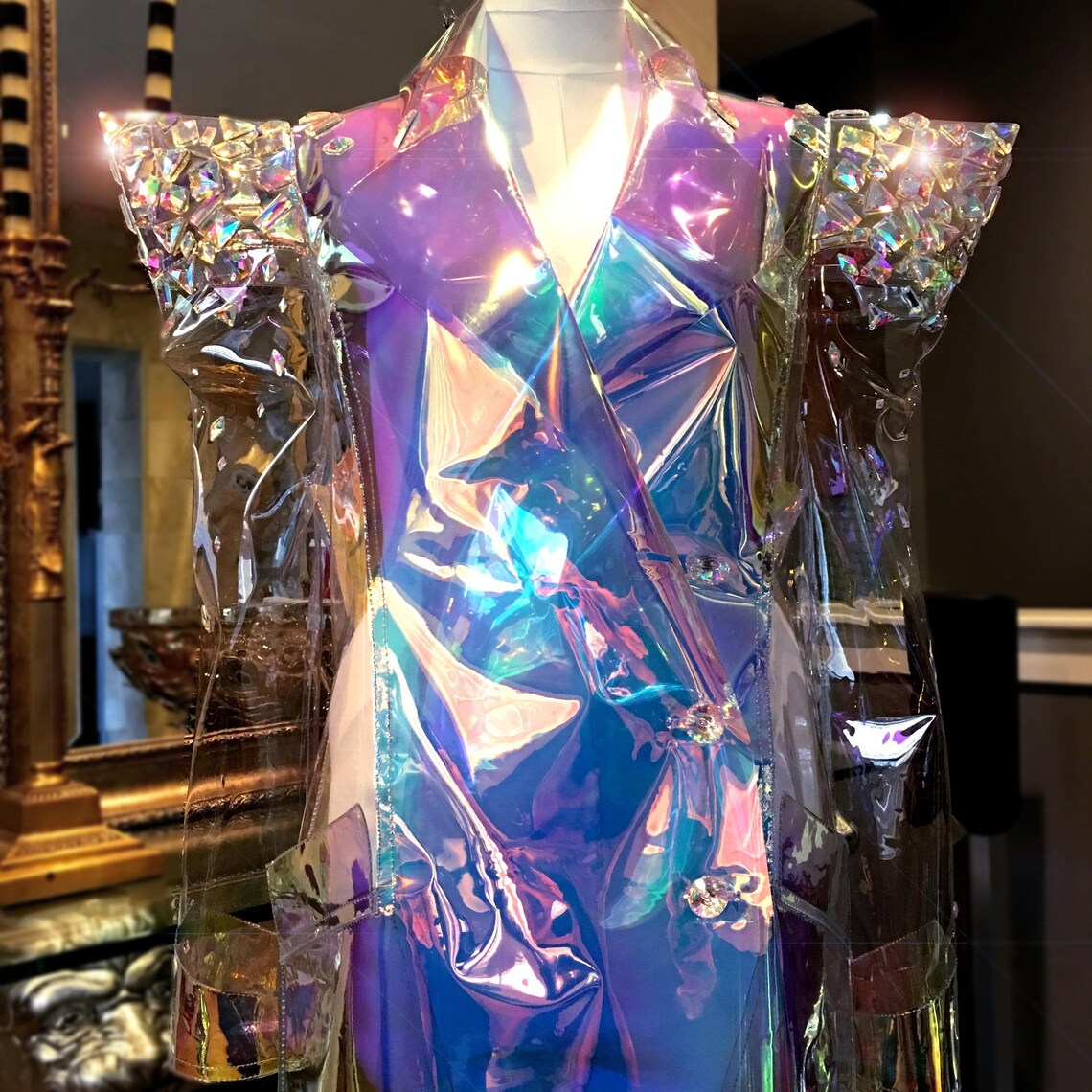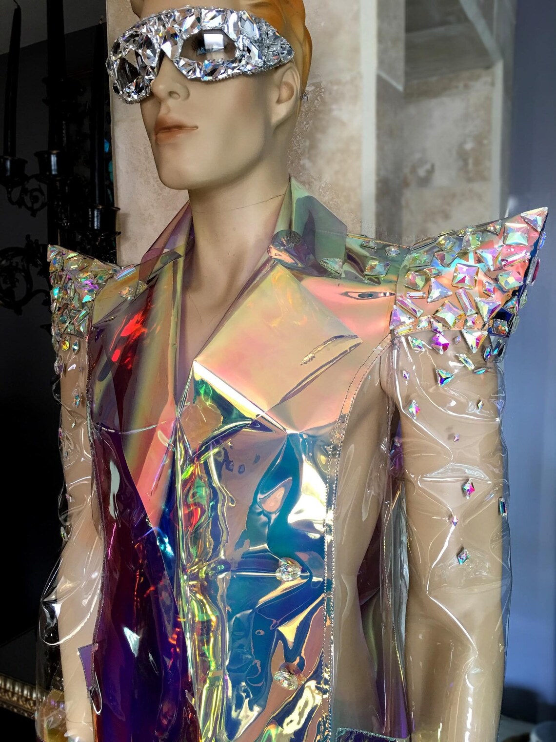 Originally designed for Lady Gaga , this tailored trench coat is out of this world. This jacket is a one-of-a-kind and is detailed in antique Swarovski crystal buttons and Swarovski crystal element details on the shoulders and sleeves. This jacket features clear vinyl side panels and pockets. Can be worn alone or over top your choice of clothing style. This is a jacket no one will forget! Don't get caught out in the rain unless you're wearing this beauty!