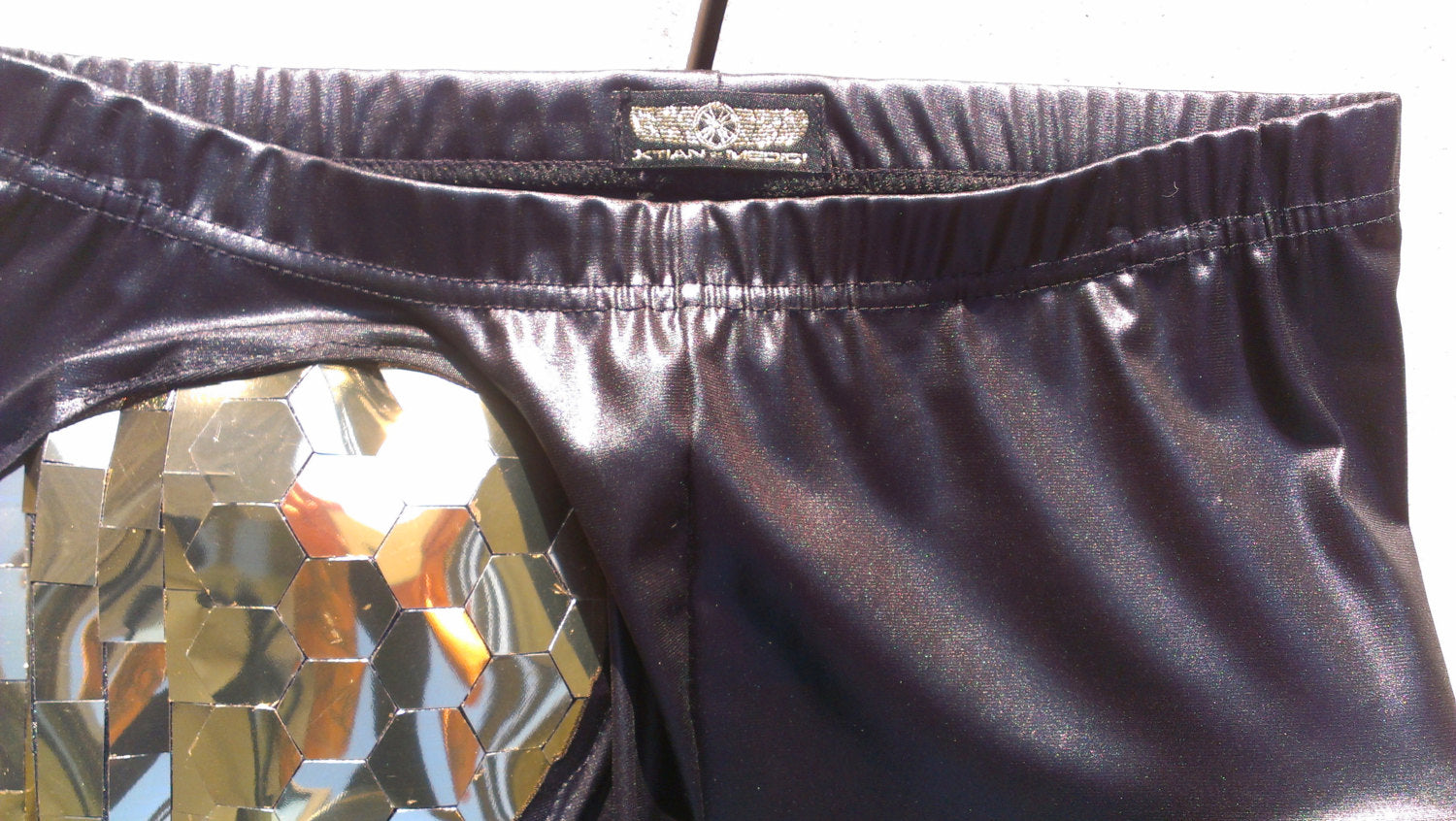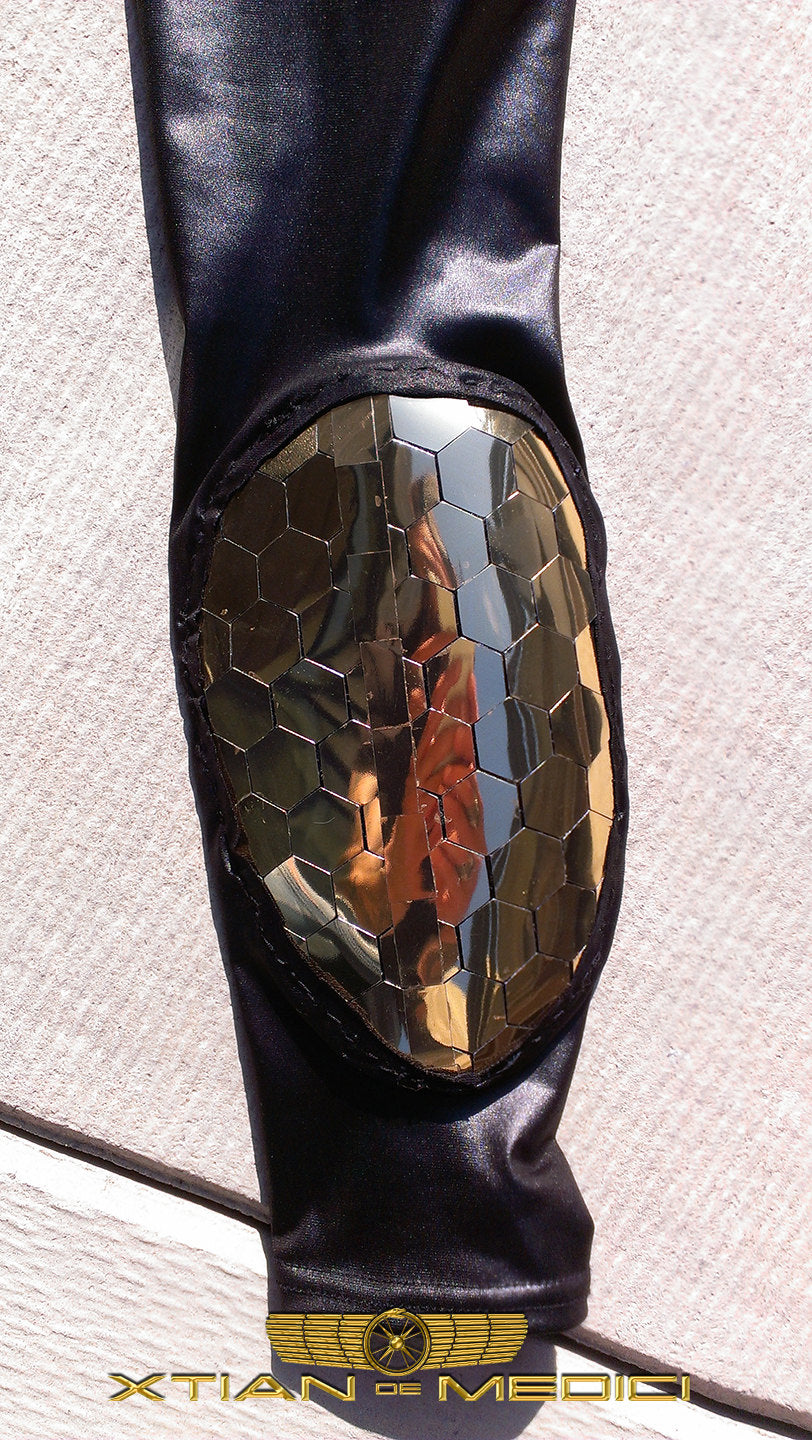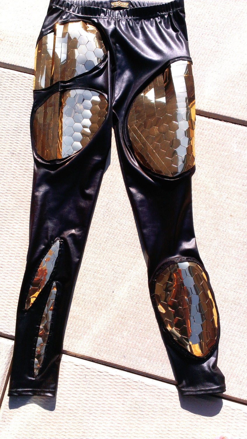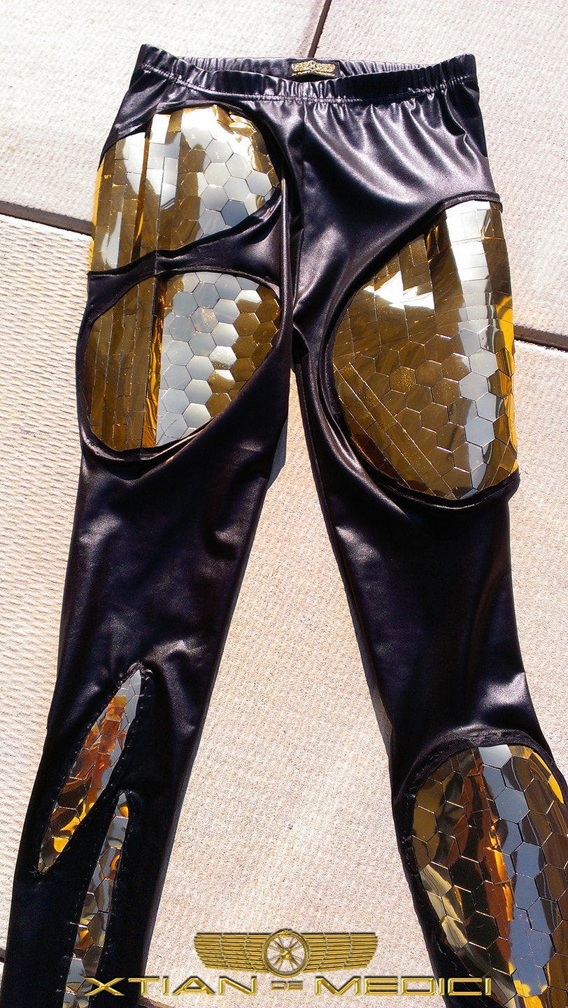 L'heureux acheteur possédera un legging unique en son genre en spandex noir avec des découpes coucou qui révèlent notre finition géométrique et robotique exclusive en PVC miroir doré. Les gens vous verront venir à des kilomètres dans ces leggings spectaculaires !