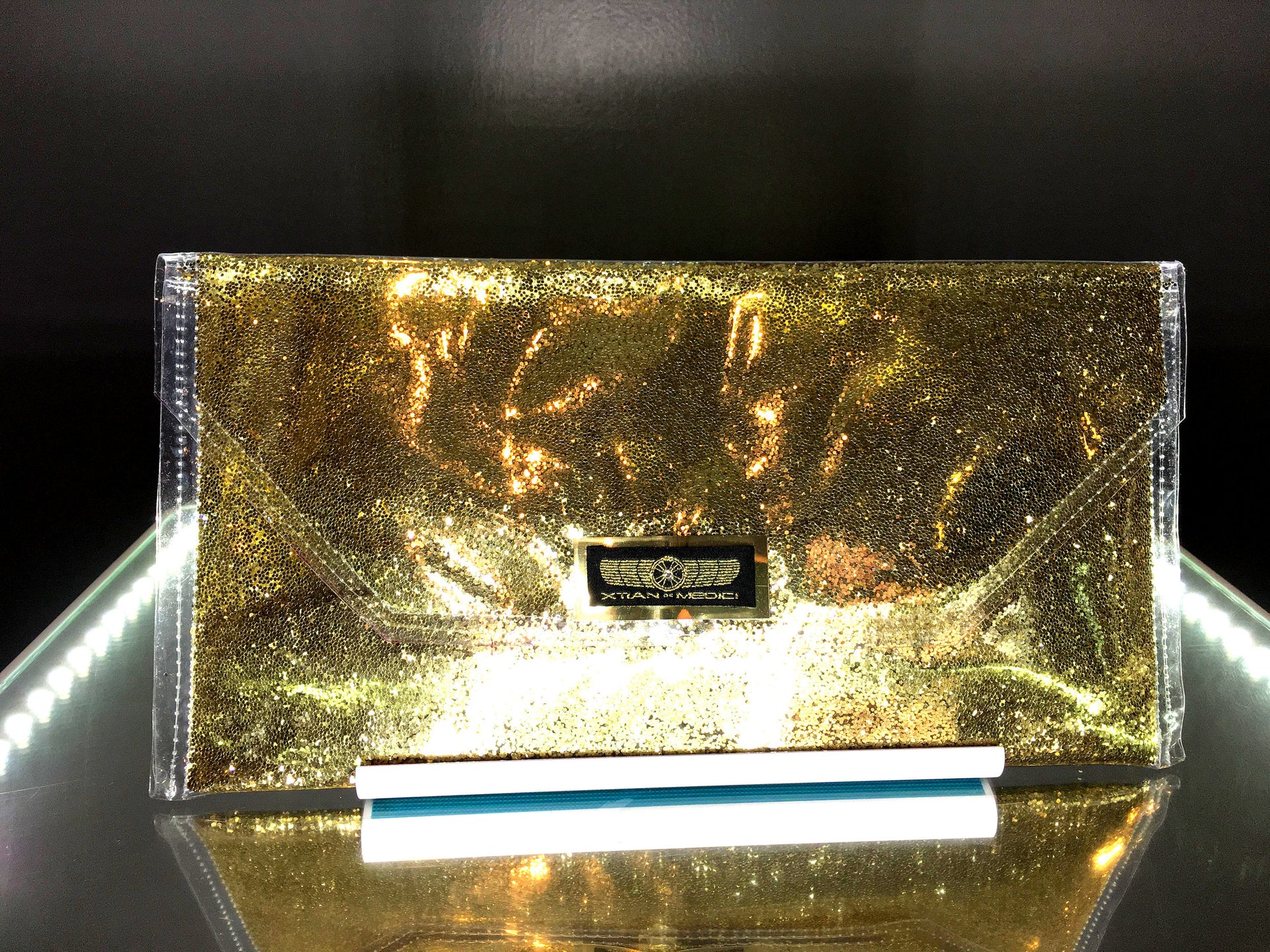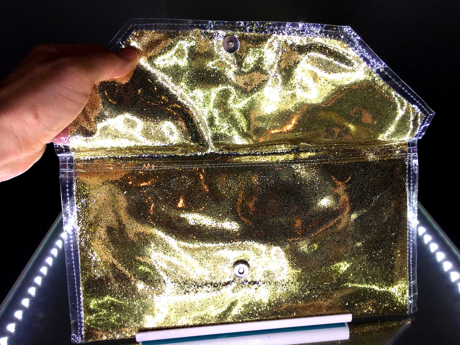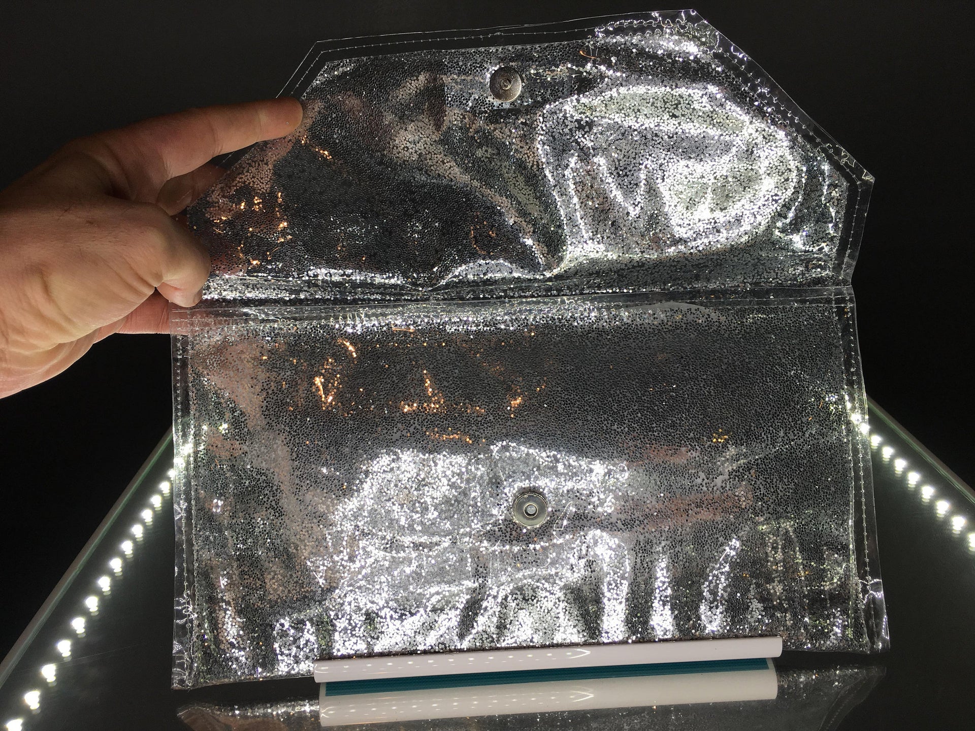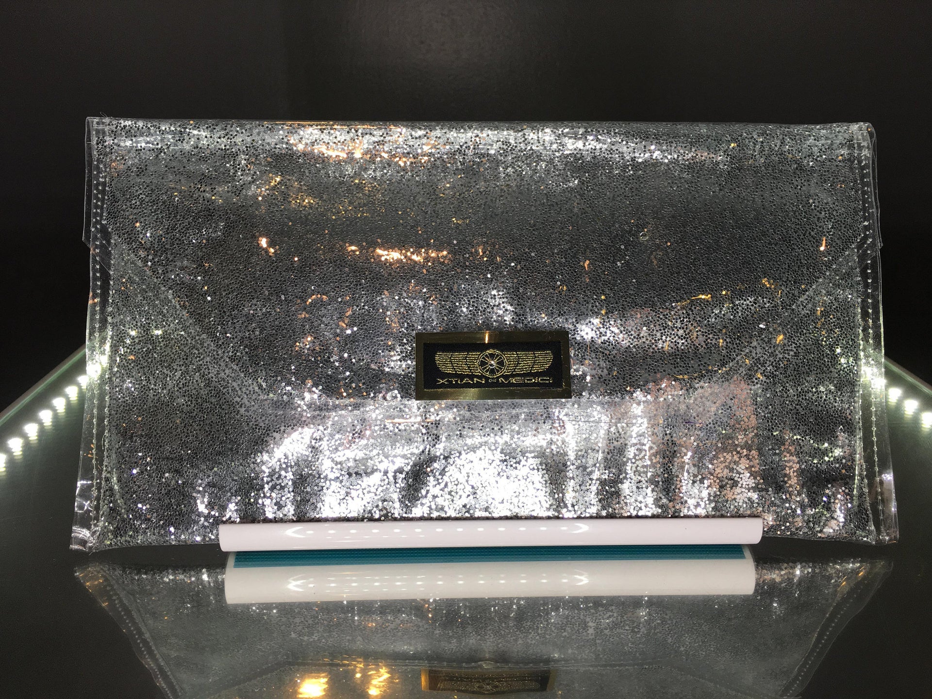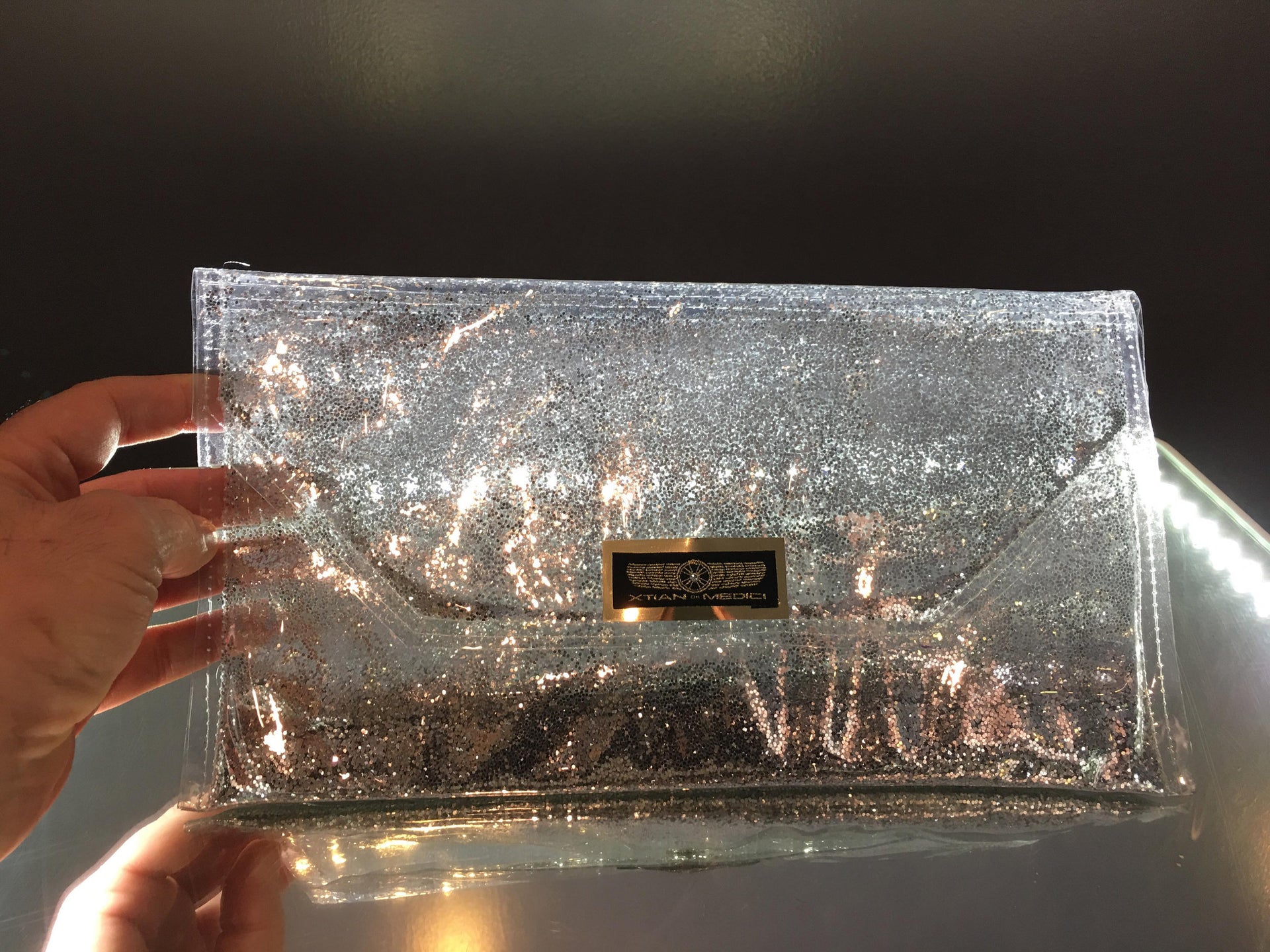 La pochette starlight est notre design en instance de brevet !! Ce sac amusant est limpide jusqu'à ce que vous le secouiez pour créer une charge électrique statique... et voilà, vous ne pouvez pas voir ce que vous transportez dans votre sac à main car les particules de paillettes se réorganisent et s'alignent pour créer un miroir métallique. mur de brillance !